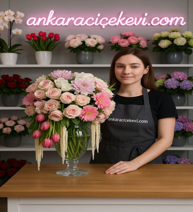 Cam Vazoda Tasarım Lale ve Gül Arajmanı
